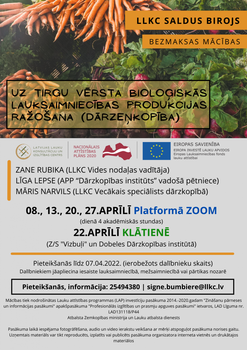 LLKC Saldus konsultāciju birojs aicina Jūs apmeklēt bezmaksas mācības "Uz tirgu vērsta bioloģiskās lauksaimniecības produkcijas ražošana (lietpratējiem) (dārzeņu audzēšana)".