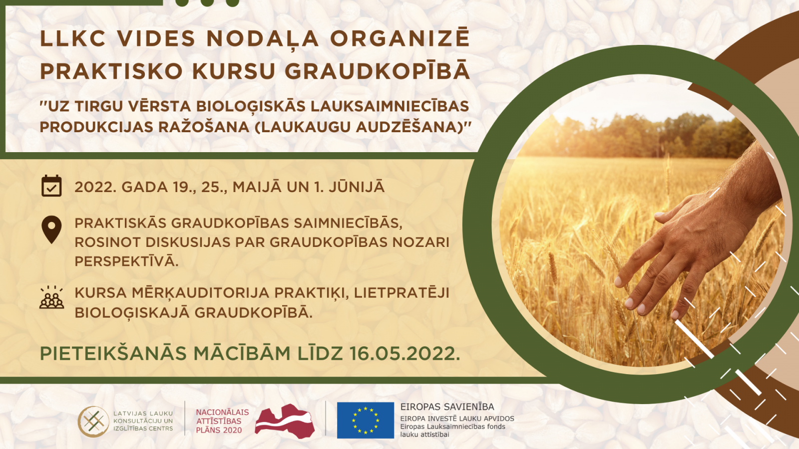 Latvijas Lauku konsultāciju un izglītības centra Vides nodaļa sadarbībā ar nozares praktiķiem organizē mācības bioloģiskajā graudkopībā. Interesenti var pieteikties kursam “Uz tirgu vērsta bioloģiskās lauksaimniecības produkcijas ražošana (laukaugu audzēšana)” Latvijas trīs novados Vidzemē, Kurzemē, Latgalē. Pasākuma norises laiks – 19., 25. maijā un 1. jūnijā no plkst. 10 līdz 17.