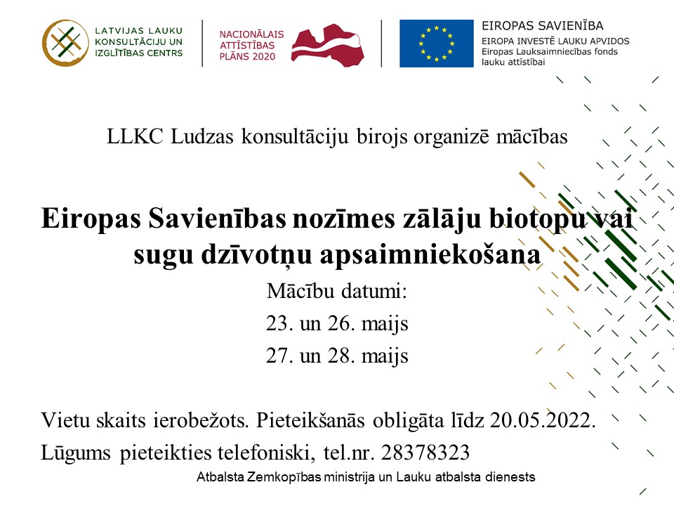 Mācības tiek nodrošinātas Lauku attīstības programmas (LAP) 2014.-2020. apakšpasākums “Profesionālās izglītības un prasmju apguves pasākumi” ietvaros, LAD Līguma nr. LAD131118/P44. Atbalsta Zemkopības ministrija un Lauku atbalsta dienests.