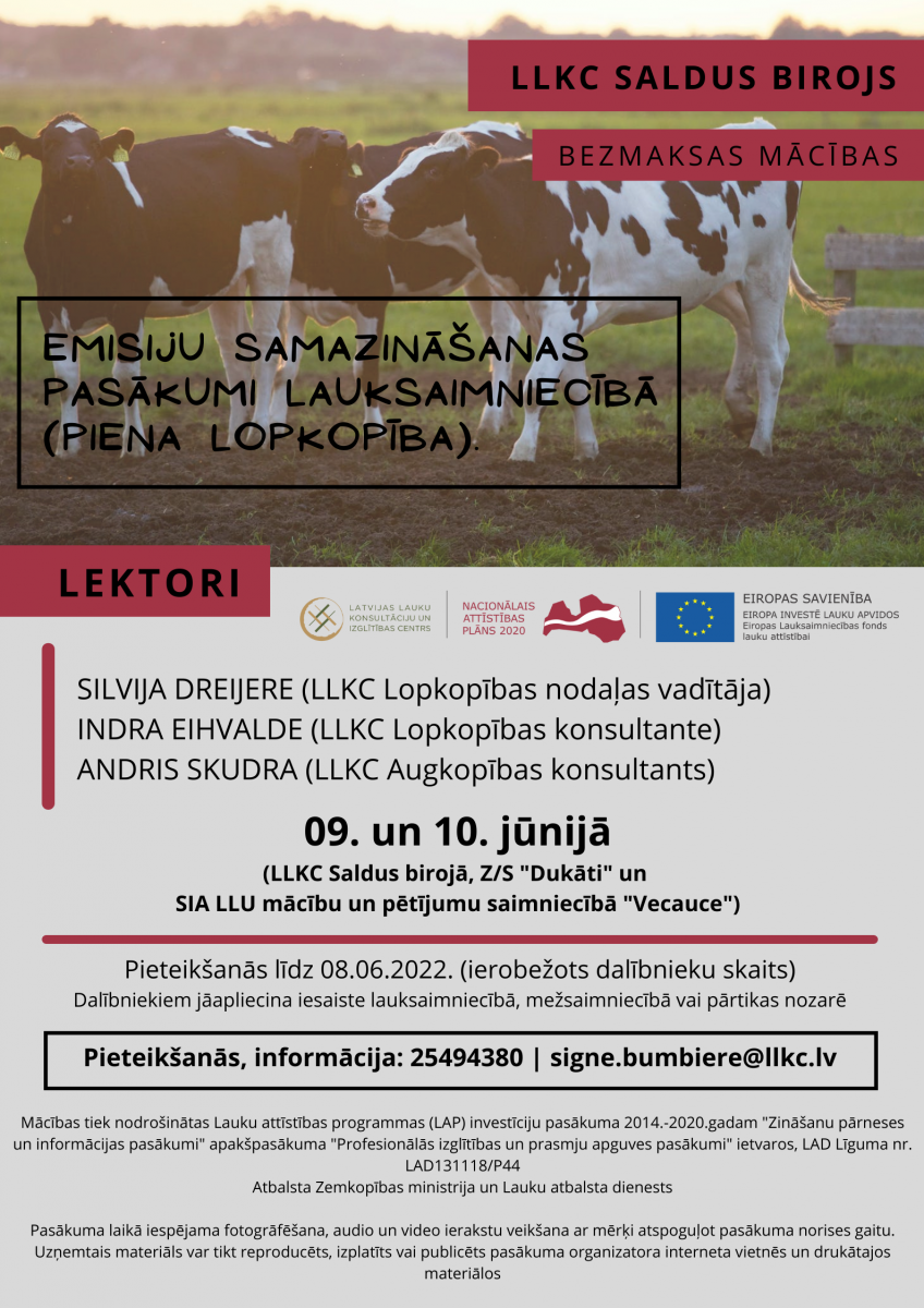 LLKC Saldus konsultāciju birojs aicina Jūs apmeklēt bezmaksas mācības "Emisiju samazināšanas pasākumi lauksaimniecībā (piena lopkopība). Izmaksu efektīvie siltumnīcefekta gāzu emisiju (SEG) ierobežojošie pasākumi ražošanas energoefektivitātes uzlabošanai un SEG samazināšanai uz produkcijas vienību ".
