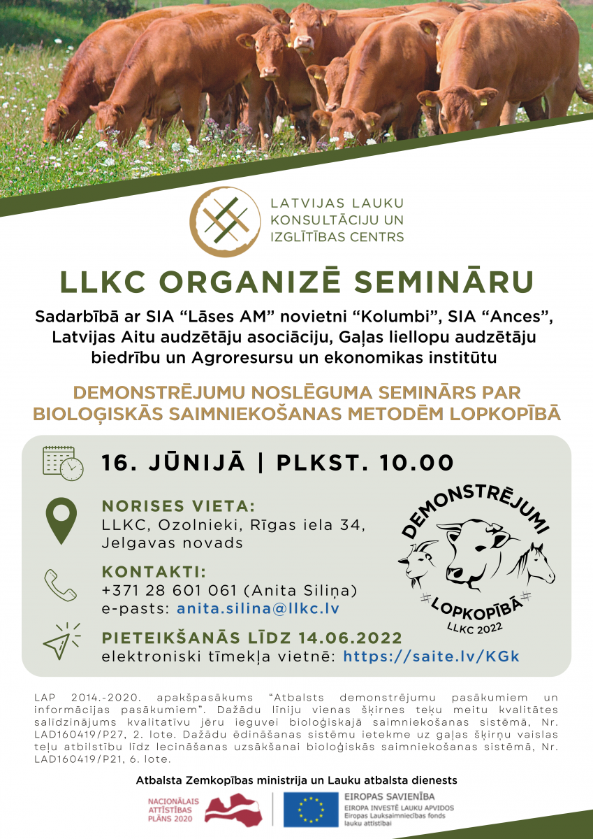 LLKC sadarbībā ar SIA “Lāses AM” novietni “Kolumbi”, SIA “Ances”, Latvijas Aitu audzētāju asociāciju, Gaļas liellopu audzētāju biedrību un Agroresursu un ekonomikas institūtu aicina 16. jūnijā piedalīties demonstrējumu noslēguma seminārā par bioloģiskās saimniekošanas metodēm lopkopības saimniecībās.