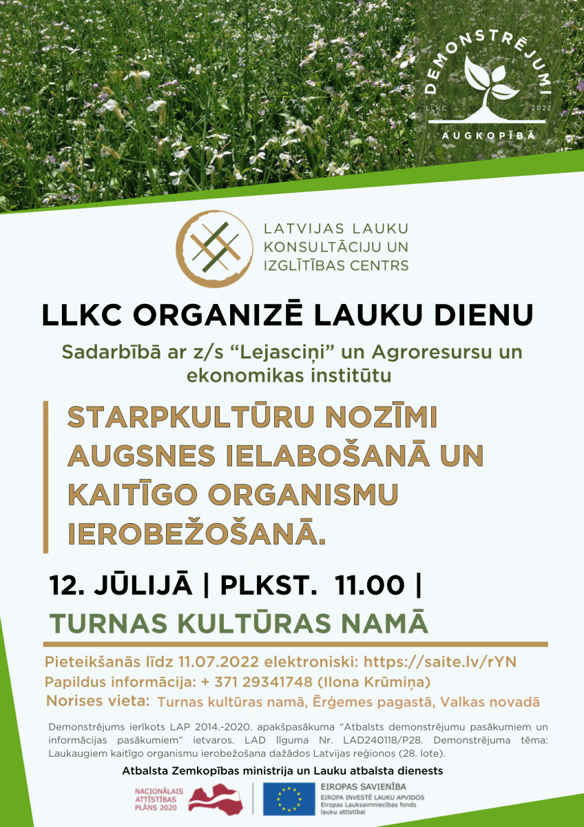 LLKC sadarbībā ar z/s “Lejasciņi” un Agroresursu un ekonomikas institūtu 12. jūlijā aicina apmeklēt lauka dienu  par starpkultūru nozīmi augsnes ielabošanā un kaitīgo organismu ierobežošanā.