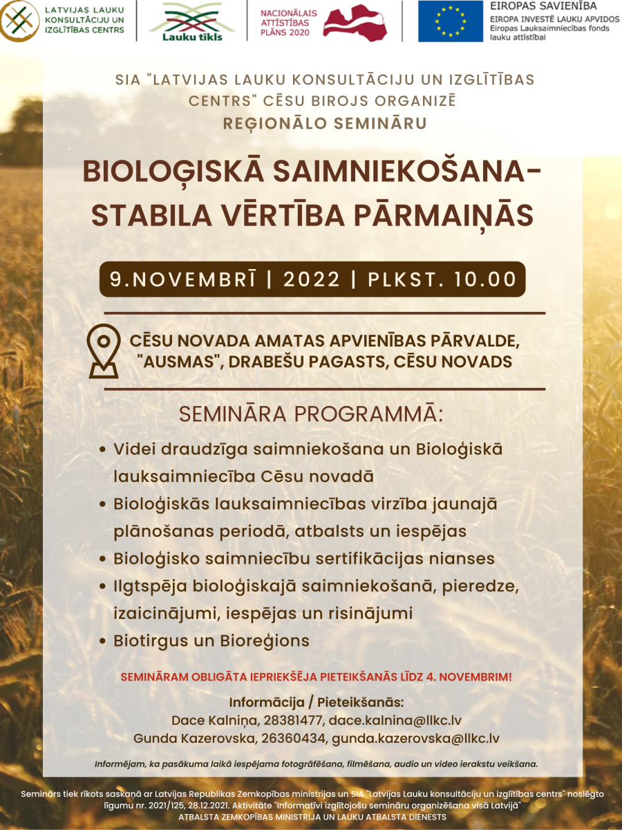 LLKC Cēsu konsultāciju birojs organizē reģionālo semināru "Bioloģiskā saimniekošana - stabila vērtība pārmaiņās". Seminārs notiks 2022.gada 9.novembrī, Amatas apvienības pārvaldē “Ausmas”, Drabešu pagastā Cēsu novadā.
