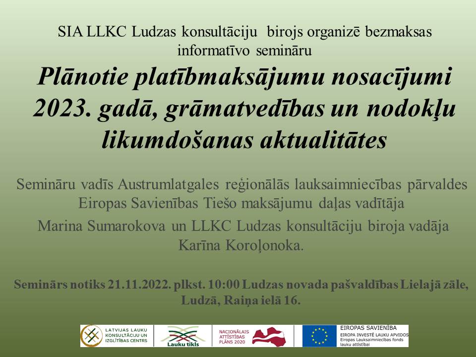 Seminārā Lauku atbalsta dienesta pārstāvji sniegs aktuālo informāciju par platībmaksājumu nosacījumiem sākot ar 2023. gadu. LLKC Ludzas konsultāciju biroja grāmatvedības konsultante Karīna Koroļonoka informēs par aktualitātēm grāmatvedības un nodokļu likumdošanā.