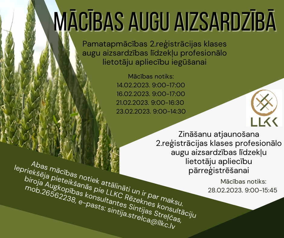 Ja kādam lauksaimniekam ir nepieciešamība iegādāties augu aizsardzības līdzekļus, bet nav apliecības vai arī jau esošai apliecībai beidzas derīguma termiņš, tad var apmeklēt LLKC Rēzeknes konsultāciju biroja piedāvātās mācības augu aizsardzībā.