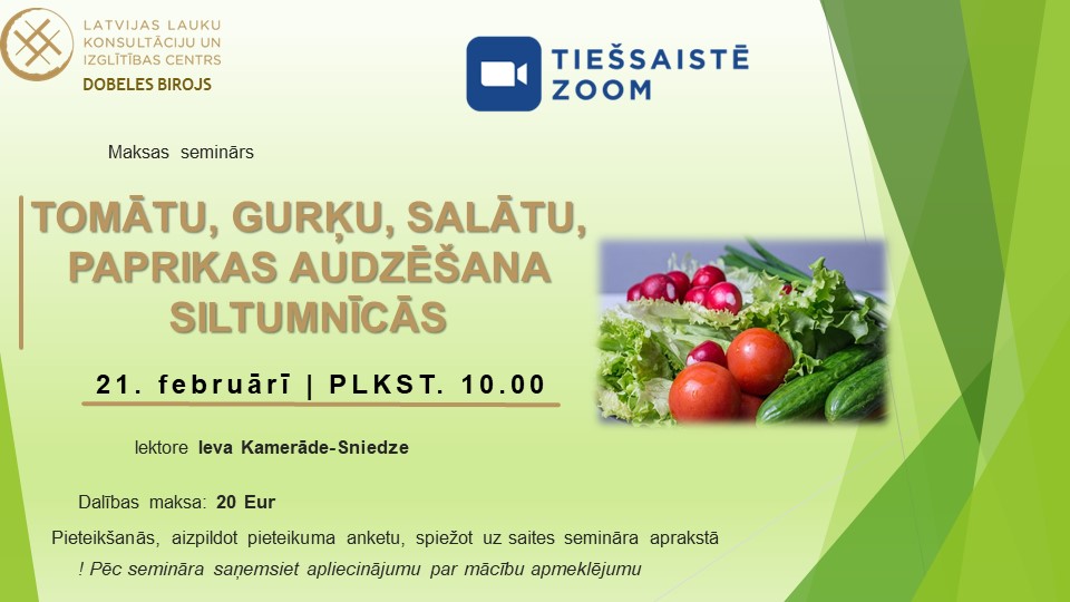 21.02 plkst. 10.00 – 14.15 Tomātu, gurķu, salātu, paprikas audzēšana siltumnīcās