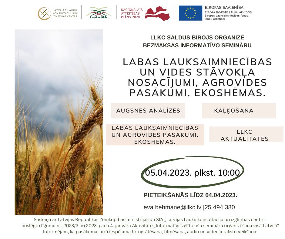 Semināra laiks un norises vieta: 5. aprīlī plkst.10:00, LLKC Saldus birojā, Viesnīcas ielā 1 (3. Stāva zālē)