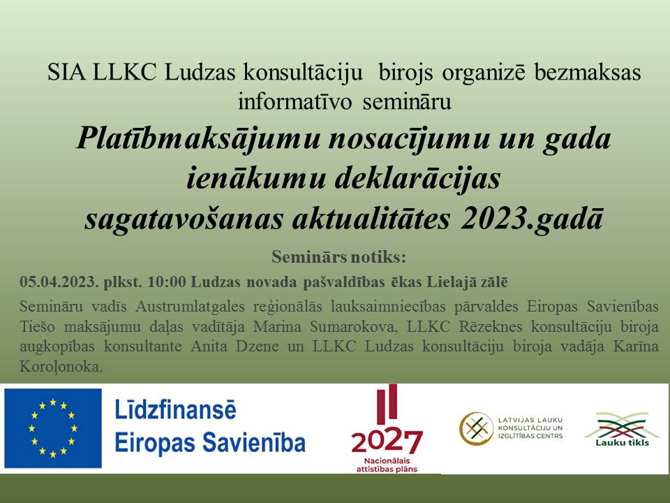 Semināru vadīs Austrumlatgales reģionālās lauksaimniecības pārvaldes Eiropas Savienības Tiešo maksājumu daļas vadītāja Marina Sumarokova, LLKC Rēzeknes konsultāciju biroja augkopības konsultante Anita Dzene un LLKC Ludzas konsultāciju biroja vadāja Karīna Koroļonoka.