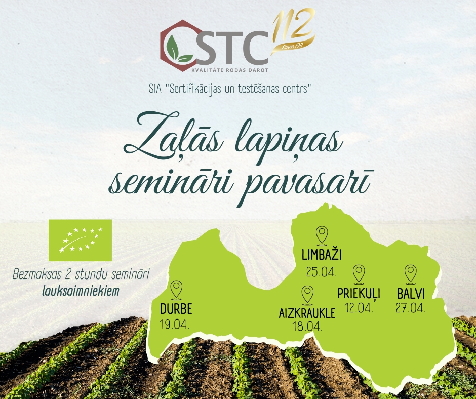 SIA "Sertifikācijas un testēšanas centrs" aicina lauksaimniekus uz bezmaksas ZAĻĀS LAPIŅAS semināriem 2023.gada pavasarī.