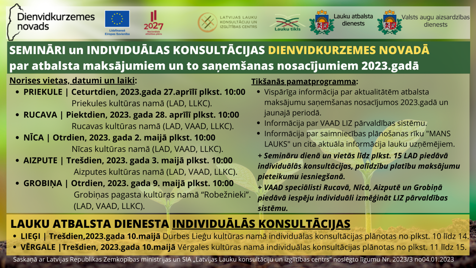 # GROBIŅĀ (seminārs+konsultācijas) | Otrdien, 2023. gada 9. maijā plkst. 10:00 Grobiņas pagasta kultūras namā “Robežnieki” (piedalās: LAD, VAAD, LLKC). LAD konsultācijas līdz plkst. 15:00.