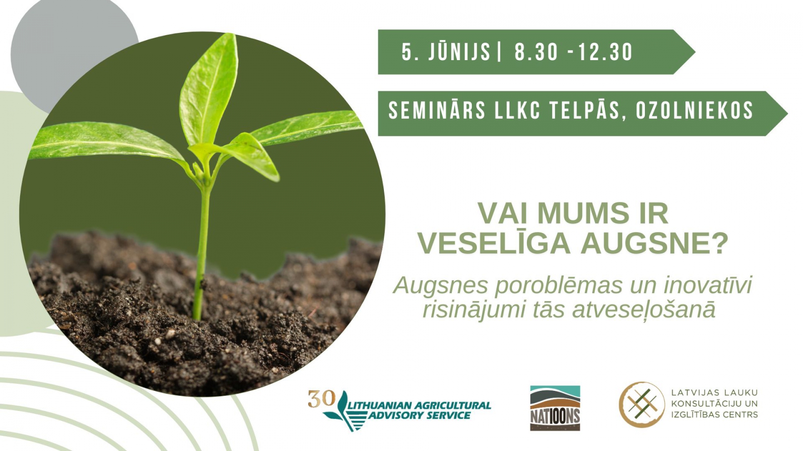 LLKC Vides nodaļa sadarbībā ar Lietuvas Lauksaimniecības konsultāciju dienestu 5. jūnijā no pulksten 8.30 – 12.30 organizē klātienes semināru “Vai mums ir veselīga augsne? Augsnes problēmas un inovatīvi risinājumi tās atveseļošanā”.