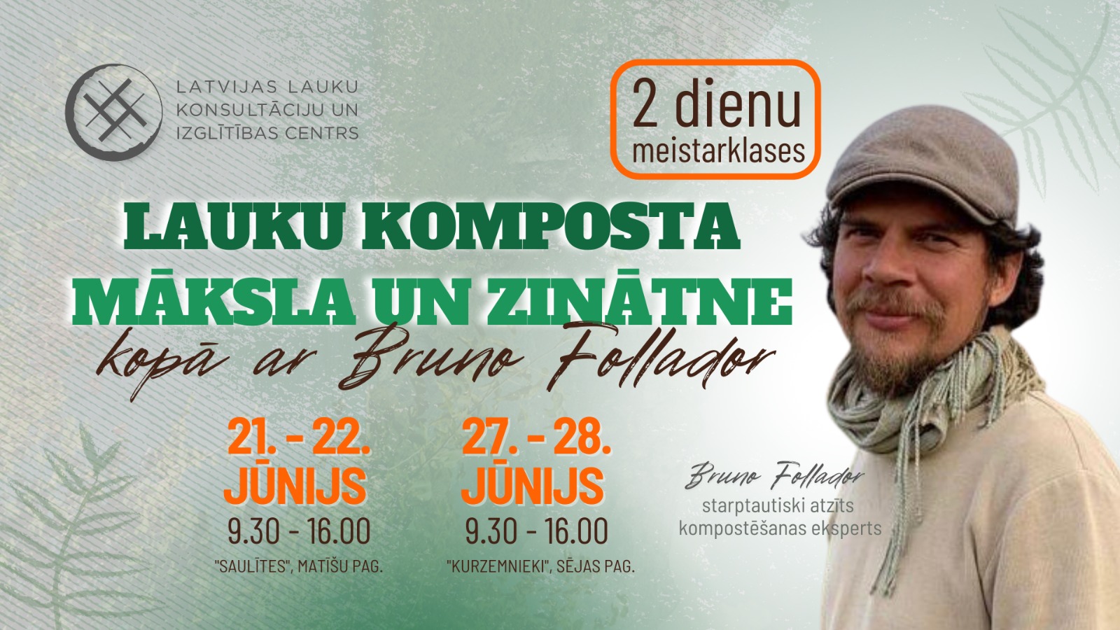 No 21. līdz 28. jūnijam Latvijas Lauku konsultāciju un izglītības centrs (LLKC) organizē Latvijā vēl nebijuša mēroga divu dienu meistarklases “Lauku komposta māksla un zinātne”, kuras vadīs starptautiski atzīts eksperts Bruno Folladors (Bruno Follador).