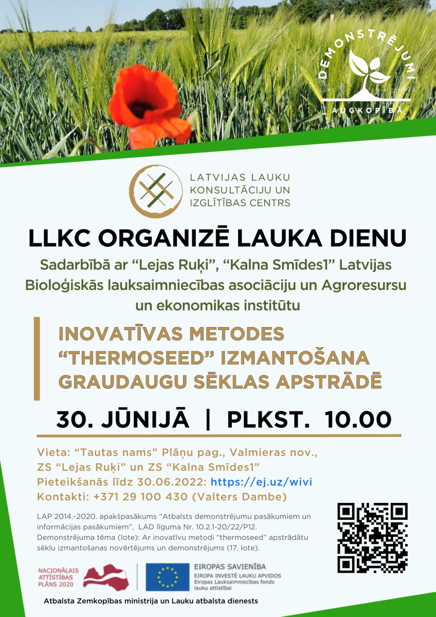LLKC sadarbībā ar saimniecību “Lejas Ruķi” Valmieras novada Plāņu pagastā un bioloģisko saimniecību “Kalna Smīdes1” Cēsu novada Drabešu pagastā, Latvijas Bioloģiskās lauksaimniecības asociāciju un Agroresursu un ekonomikas institūtu aicina apmeklēt lauka dienu “Inovatīvas metodes “thermoseed” izmantošana graudaugu sēklas apstrādē”.