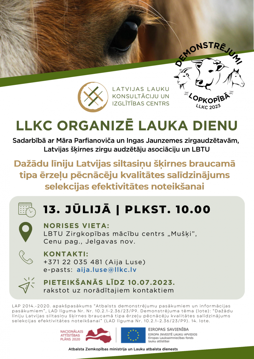LLKC sadarbībā ar Māra Parfianoviča (Jaunvangas, Siguldas pagasts, Siguldas novads) un Ingas Jaunzemes (SIA “Ādažu veterinārā klīnika”, Kroņi, Skultes pagasts, Limbažu novads) zirgaudzētavām, Latvijas šķirnes zirgu audzētāju asociāciju un LBTU rīko lauka dienu.