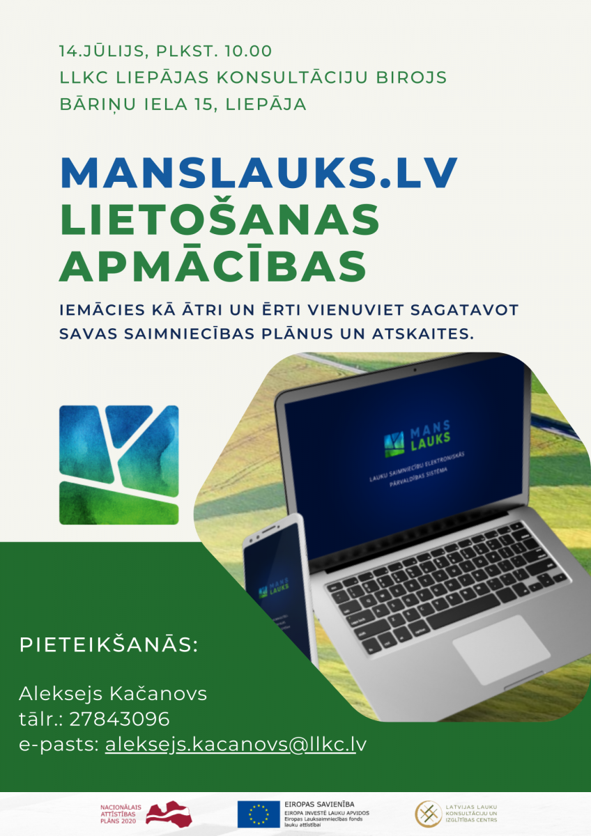 2023. gada 14. jūlijā plkst.10:00 LLKIC Liepājas konsultāciju birojā tiek aicināti lauku saimniecību pārstāvji, lai iepazītos un jau praktiski izmēģinātu lauku saimniecības pārvaldības sistēmu "Mans Lauks" - https://www.manslauks.lv/