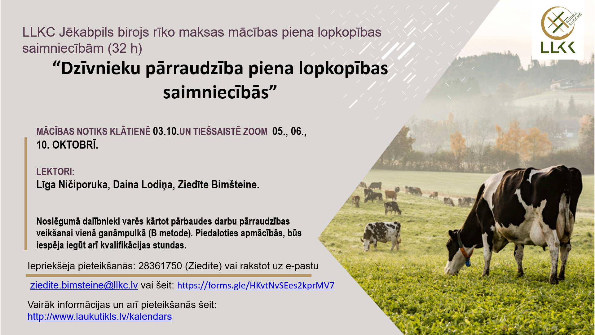 LLKC Jēkabpils birojs rīko maksas mācības piena lopkopībā “Dzīvnieku pārraudzība piena lopkopības saimniecībās” (32 stundas)