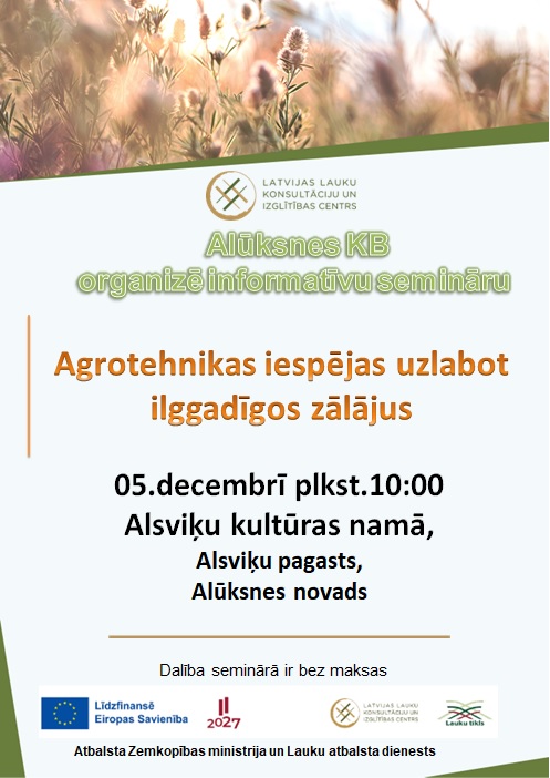 SIA LLKC Alūksnes KB organizē informatīvu semināru kā uzlabot patstāvīgās pļavas un ganības, un kā kopt bioloģiski vērtīgā zālāja platības, lai iegūtu lielāku ražu. Savās zināšanās dalīsies augkopības konsultants Valters Dambe.
