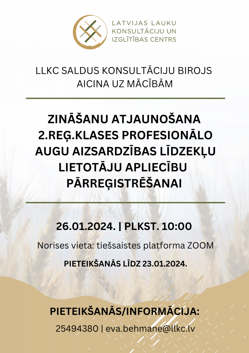 LLKC Saldus konsultāciju birojs organizē mācību kursu "Zināšanu atjaunošana 2.reģ.klases profesionālo augu aizsardzības līdzekļu lietotāju apliecību pārreģistrēšanai (atjaunošanai)".