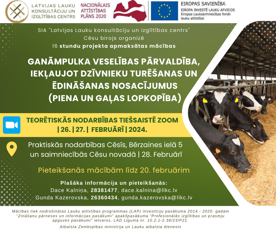 LLKC Cēsu konsultāciju birojs aicina uz 16 stundu bezmaksas mācībām "Ganāmpulka veselības pārvaldība, iekļaujot dzīvnieku turēšanas un ēdināšanas nosacījumus (piena un gaļas lopkopība)".