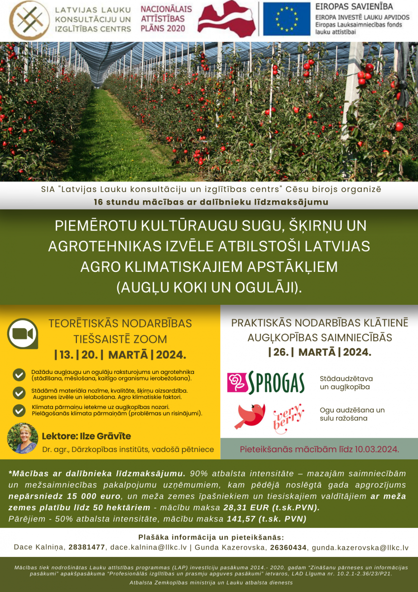 LLKC Cēsu konsultāciju birojs aicina uz mācībām "Piemērotu kultūraugu sugu, šķirņu un agrotehnikas izvēle atbilstoši Latvijas agro klimatiskajiem apstākļiem (t.sk. augu šķirņu aizsardzība, selekcionāru tiesības) (augļu koki un ogulāji)".