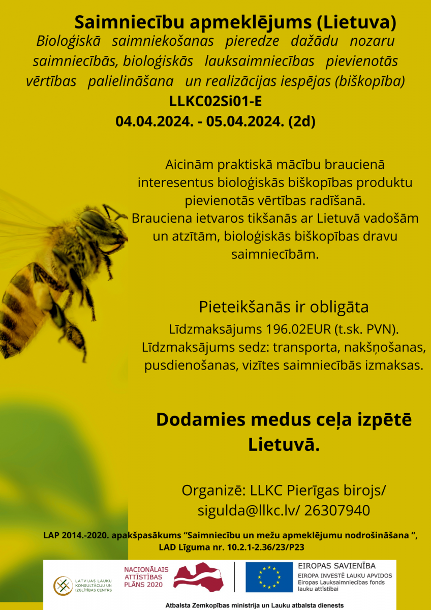 04.04.2024. un 05.04.2024. apmeklēsim Lietuvā vadošas, bioloģiski sertificētas biškopības saimniecības, lai iepazītu kaimiņu daudzveidīgo pieredzi biškopības produktu pievienotās vērtības radīšanā - no api terapijas līdz dzērienu ražošanai.