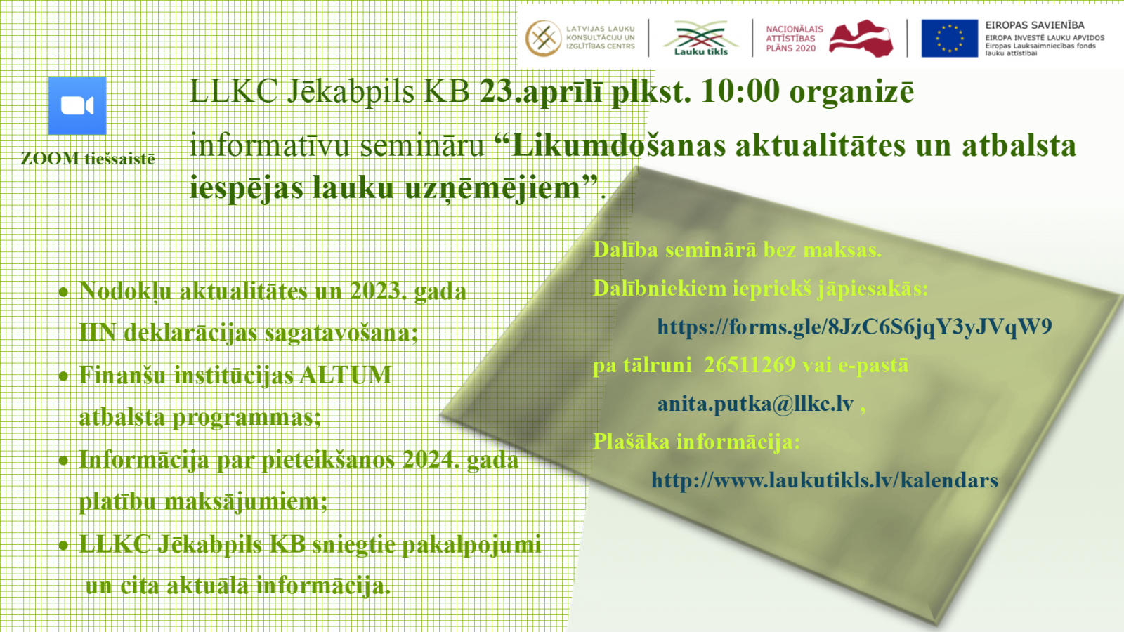 LLKC Jēkabpils birojs organizē informatīvu semināru “Likumdošanas aktualitātes un atbalsta iespējas lauku uzņēmējiem”.