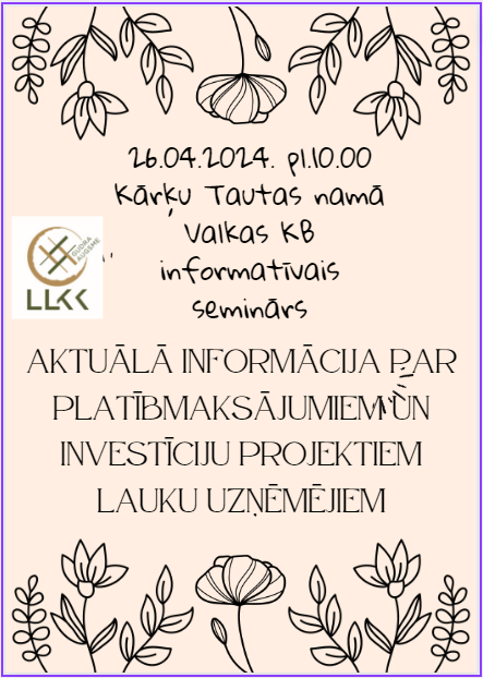 26.aprīlī pl.10.00 Kārķu pagasta Tautas namā, Valkas konsultāciju birojs organizē informatīvo semināru : Aktuālā informācija par platībmaksājumiem un investīciju projektiem lauku uzņēmējiem 2024.gada pavasarī