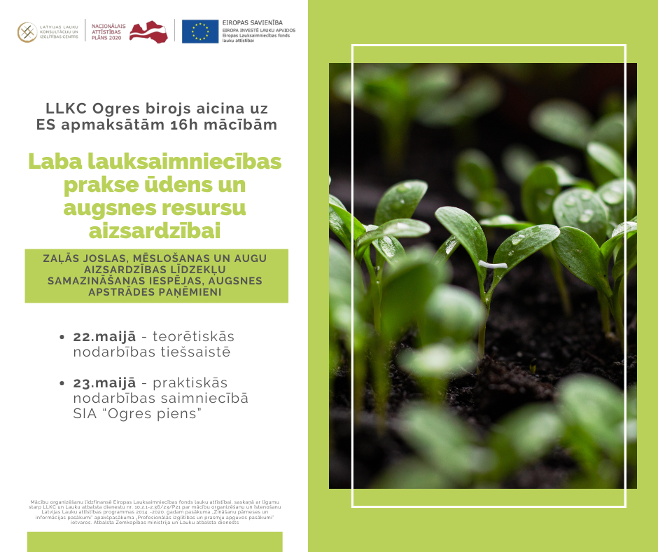 SIA LLKC Ogres birojs aicina uz 16h ES finansētām mācībām “Laba lauksaimniecības prakse ūdens un augsnes resursu aizsardzībai” (t.sk. zaļās joslas, mēslošanas un augu aizsardzības līdzekļu samazināšanas iespējas, augsnes apstrādes paņēmieni)