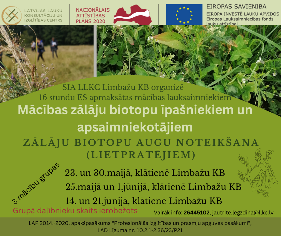 SIA LLKC Limbažu konsultāciju birojs aicina lauksaimniekus uz mācībām "Zālāju biotopu augu noteikšana (lietpratējiem)"