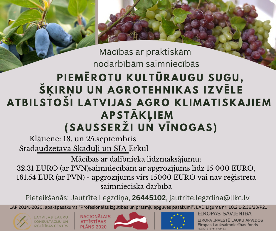 LLKC Limbažu KB organizē divu dienu klātienes mācības ar praktiskām nodarbībām saimniecībās par vīnogu un sausseržu stādījumu ierīkošanu, audzēšanu, kopšanu, mēslošanu, veidošanu, izmaksu novērtēšanu un protams zinošu praktiķu ieteikumiem!