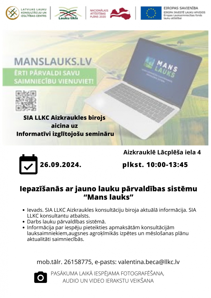 Latvijas Lauku konsultāciju un izglītības centra Aizkraukles birojs 26.09.2024, aicina uz bezmaksas informatīvo semināru –