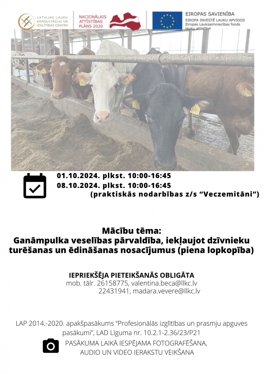 SIA LLKC Aizkraukles birojs aicina uz bezmaksas16 h mācībām “Ganāmpulka veselības pārvaldība, iekļaujot dzīvnieku turēšanas un ēdināšanas nosacījumus (piena lopkopība)