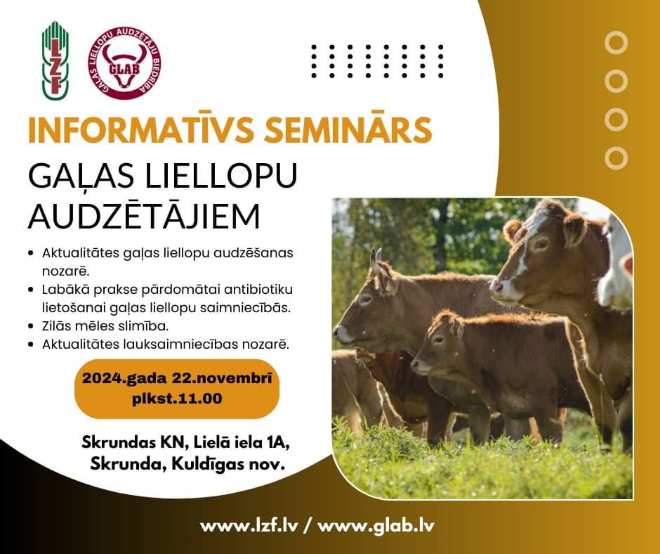 Biedrība “Latvijas Zemnieku federācija” (LZF) un “Gaļas liellopu audzētāju biedrība” (GLAB) aicina lauksaimniekus, īpaši gaļas liellopu audzētājus, uz INFORMATĪVO SEMINĀRU 2024. gada 22. novembrī, plkst.11.00 Skrundas kultūras nama mazajā zālē, Lielā iela 1A, Skrunda, Kuldīgas novads, LV-3326.