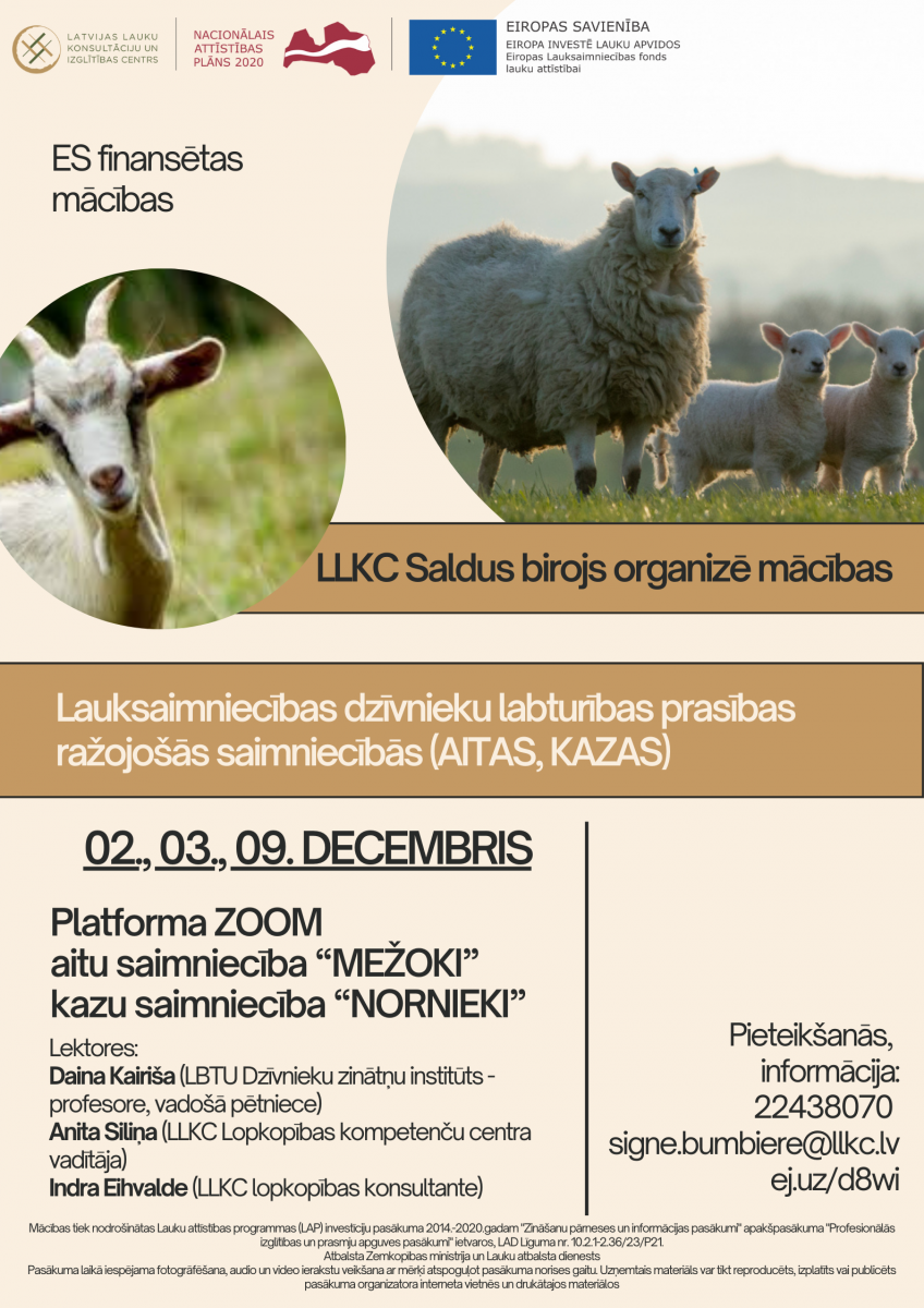 LLKC Saldus konsultāciju birojs aicina Jūs apmeklēt ES apmaksātas mācības: "Lauksaimniecības dzīvnieku labturības prasības ražojošās saimniecībās (aitas, kazas)”.
