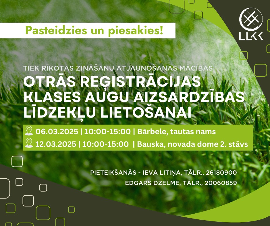 LLKC Bauskas konsultāciju birojs rīko otrās reģistrācijas klases augu aizsardzības līdzekļu lietošanas apliecību atjaunošanas mācības. Bārbelē 6. martā plkst.10:00-15:00 un Bauskā 12.martā plkst.10:00-15:00 .