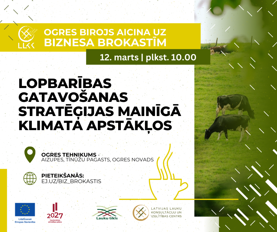 SIA LLKC Ogres birojs aicina uz Biznesa brokastīm kā profesionāļu diskusiju "Lopbarības gatavošanas stratēģijas mainīgā klimata apstākļos"