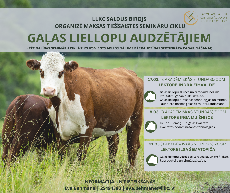 LLKC Saldus konsultāciju birojs organizē tiešsaistes maksas semināru ciklu gaļas liellopu audzētājiem.