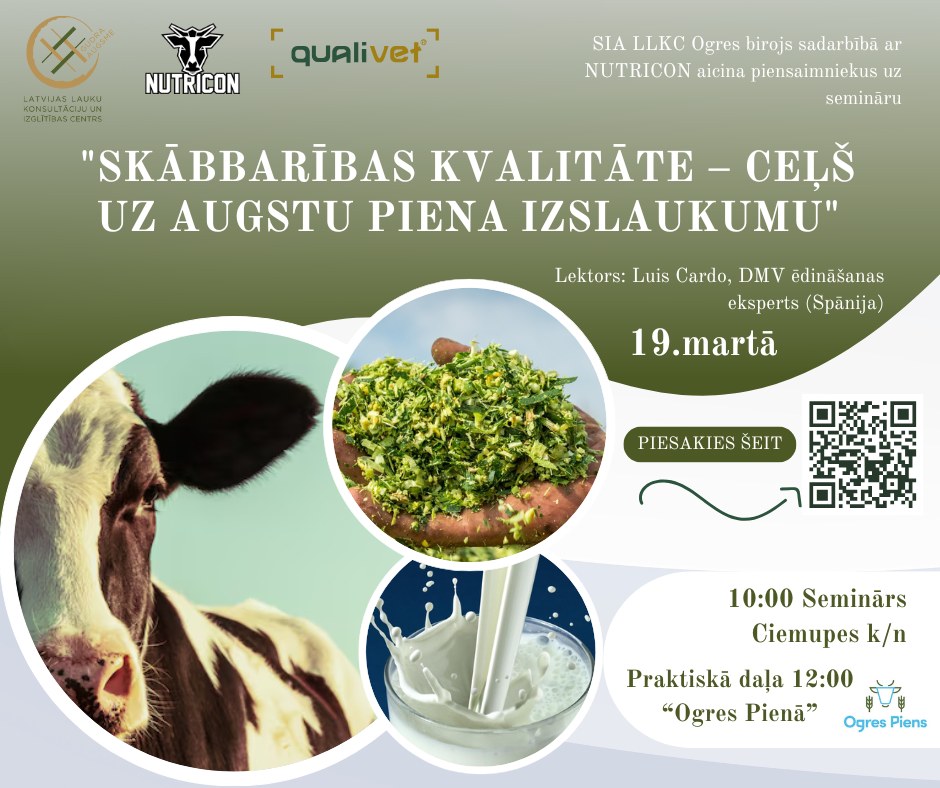 LLKC Ogres birojs sadarbībā ar SIA Nutricon Barība24 un SIA Ogres Piens, aicina uz semināru "Skābbarības kvalitāte – ceļš uz augstu piena izslaukumu"