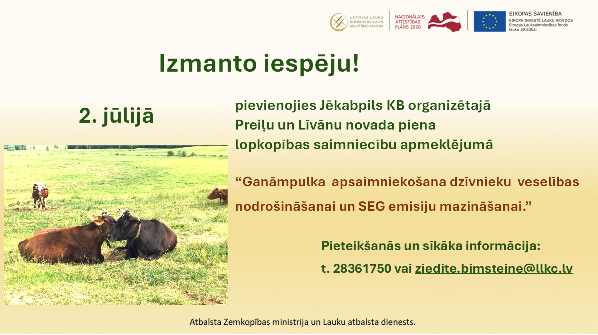 2. jūlijā Jēkabpils KB organizē Preiļu novada Rožkalnu, Stabulnieku pagastu un Līvānu novada Rudzātu pagasta piena lopkopības saimniecību apmeklējumu. Pieteikšanās: t. 26511269 vai ziedite.bimsteine@llkc.lv