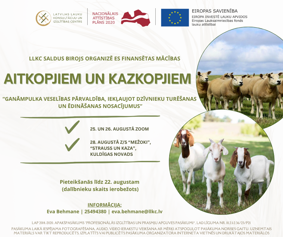 Aicinām apmeklēt ES finansētas mācības: “Ganāmpulka veselības pārvaldība, iekļaujot dzīvnieku turēšanas un ēdināšanas nosacījumus (aitas/kazas)”