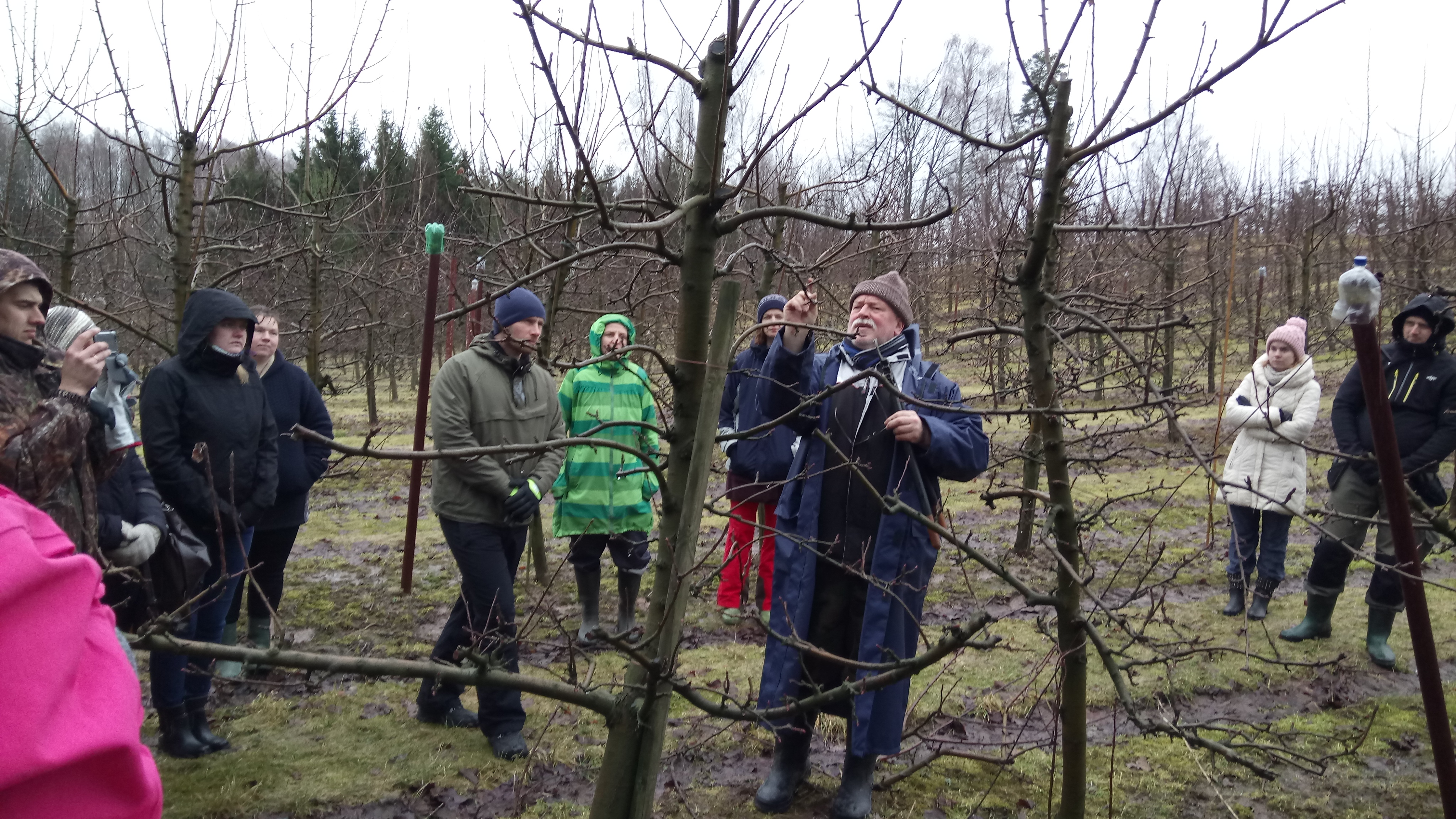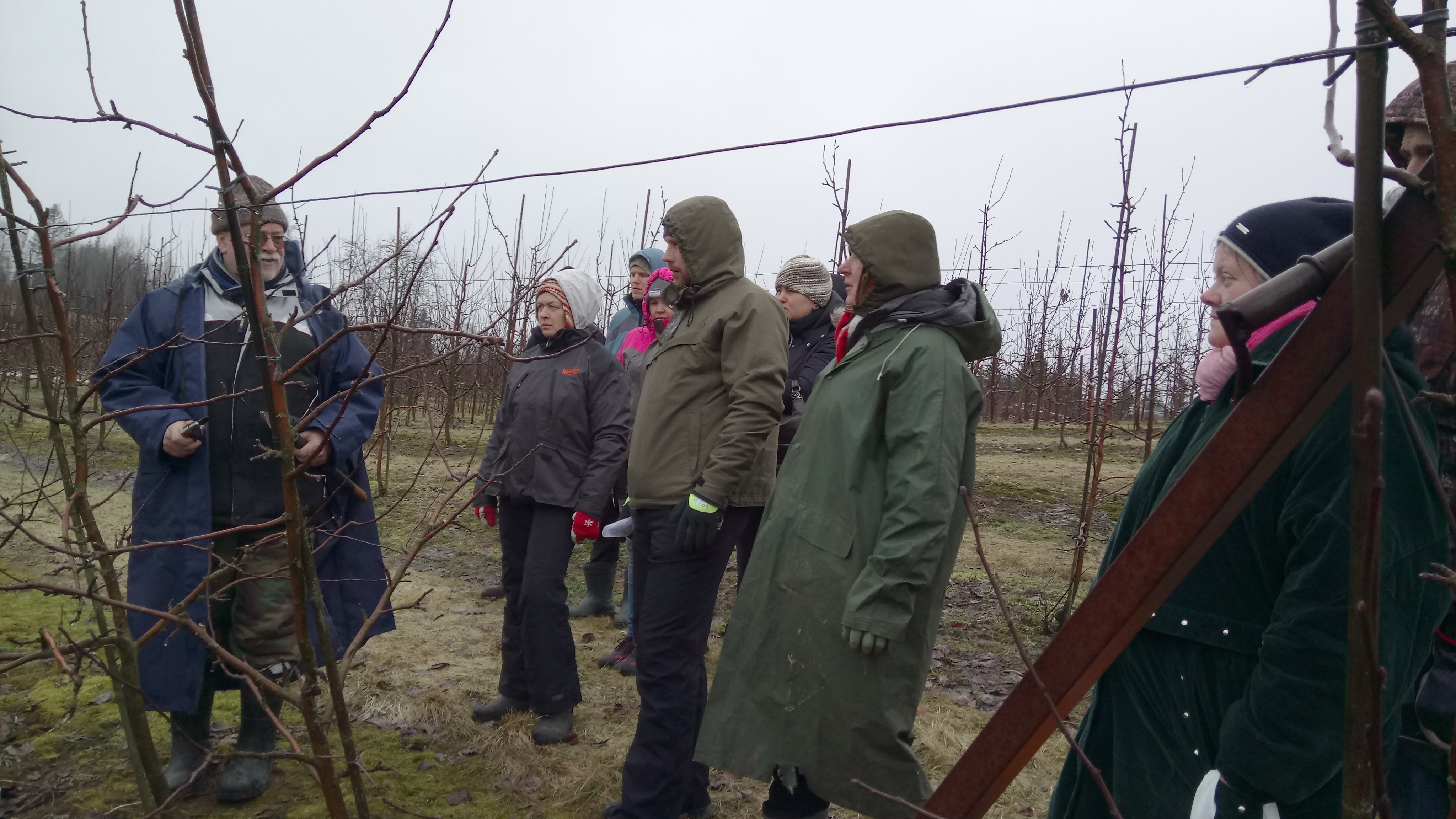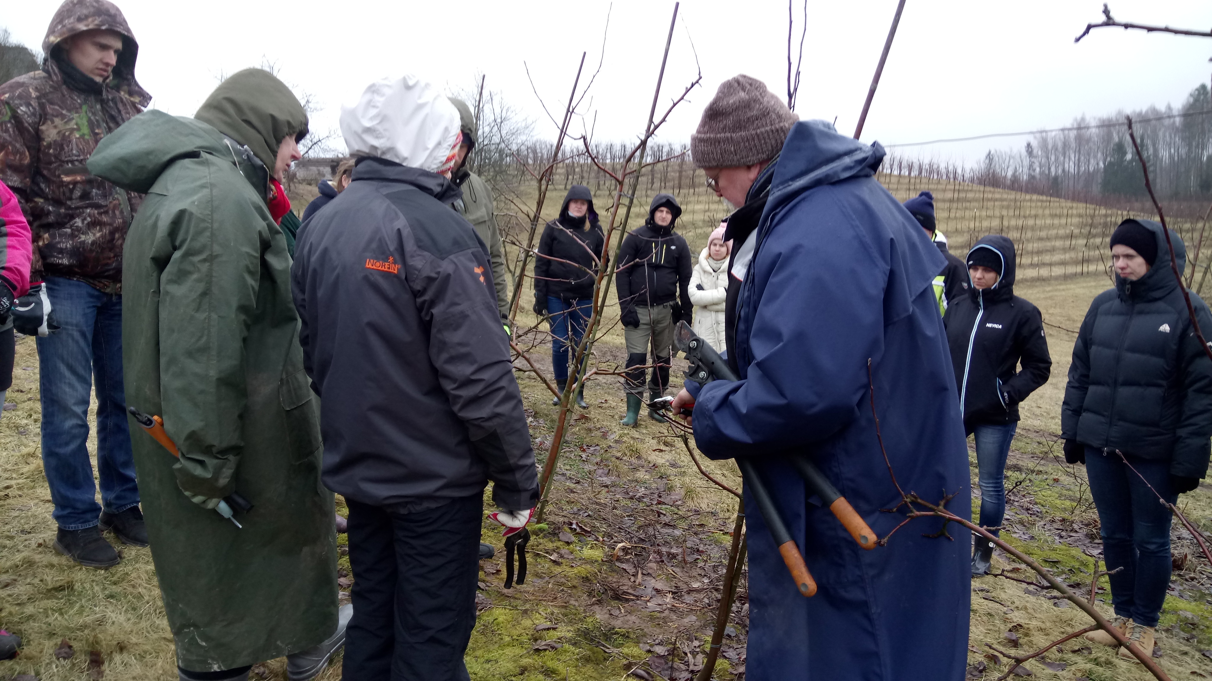 Saimnieks semināra dalībniekus veda savā ābeļdārzā un mudināja līdzdarboties zaru griešanā. Saimnieks uzsver, ka z/s ”Eglāji” mērķis ir augļu koku ražības celšana, tāpēc saimniecībā noražojušās ābeles netiek žēlotas, tās nomaina ar jaunām. Zarus griež no aprīļa līdz pat augustam. Tika demonstrēta dārza daļa, kas tika griezta pa mēnešiem pakāpeniski, – jo vēlāk griezti zari, jo mazāk lieku, un nākamajā gadā var izgriezt mazāk. Tāpat semināra dalībnieki tika iepazīstināti ar dārzā audzētajām ābeļu šķirnēm, to ražību, ziemcietību, augļu kvalitāti, garšas un izskata atbilstību pircēju prasībām. Z/s ”Eglāji” lielākoties savā dārzā stāda ziemeļu šķirnes, kuras labi pārziemo Latvijas mainīgajos dabas apstākļos, piemēram, “Konfetnaja”, “Tīna”, “Auksis”, “Baltais dzidrais”, “Belorusskoje Maļinovoje” un citas. Dalībnieku atsaucība un ieinteresētība bija pietiekami liela, –jautājot, konsultējoties, semināru apmeklēja interesenti pat no Kurzemei attālā Viesītes novada.
