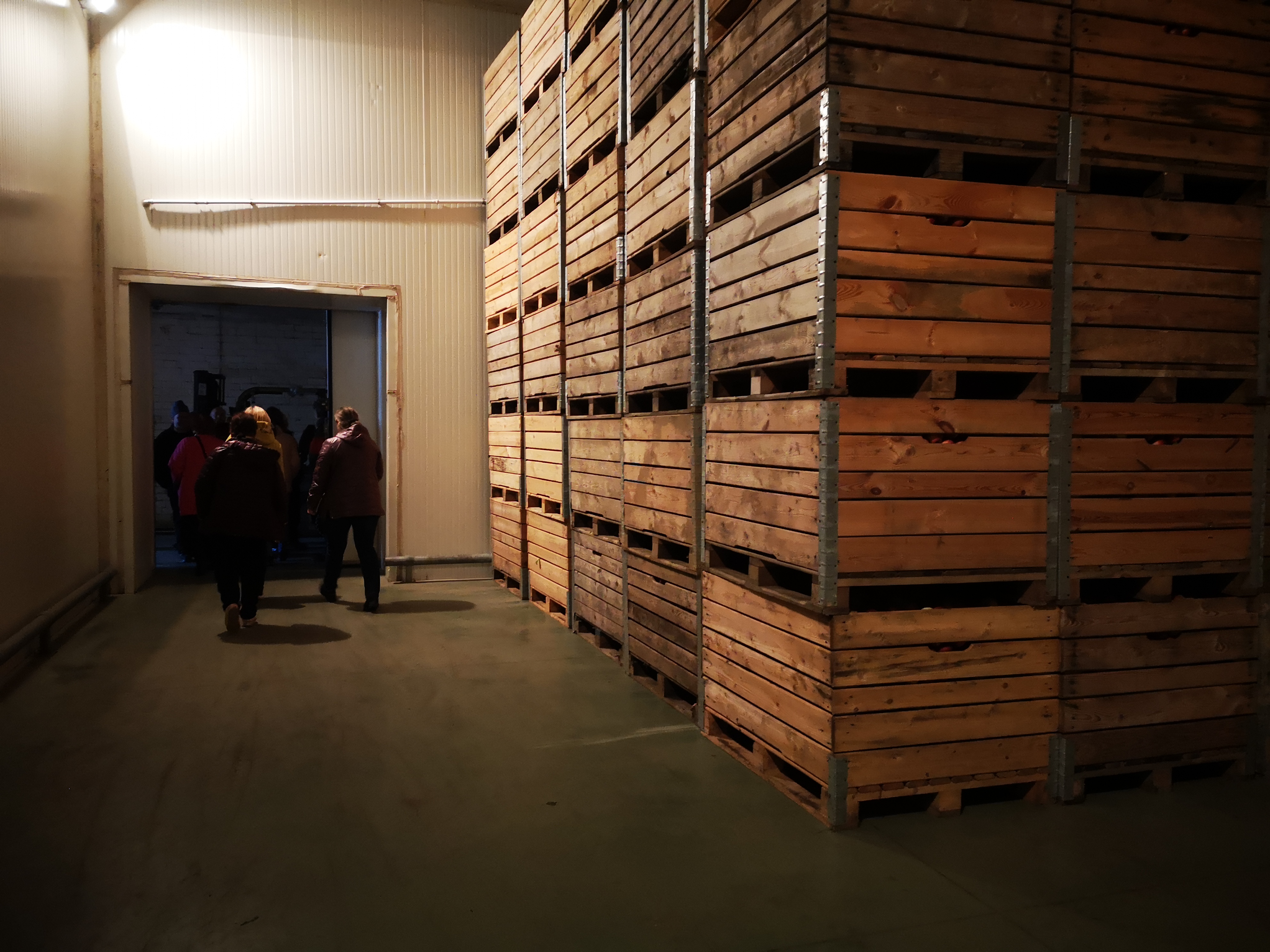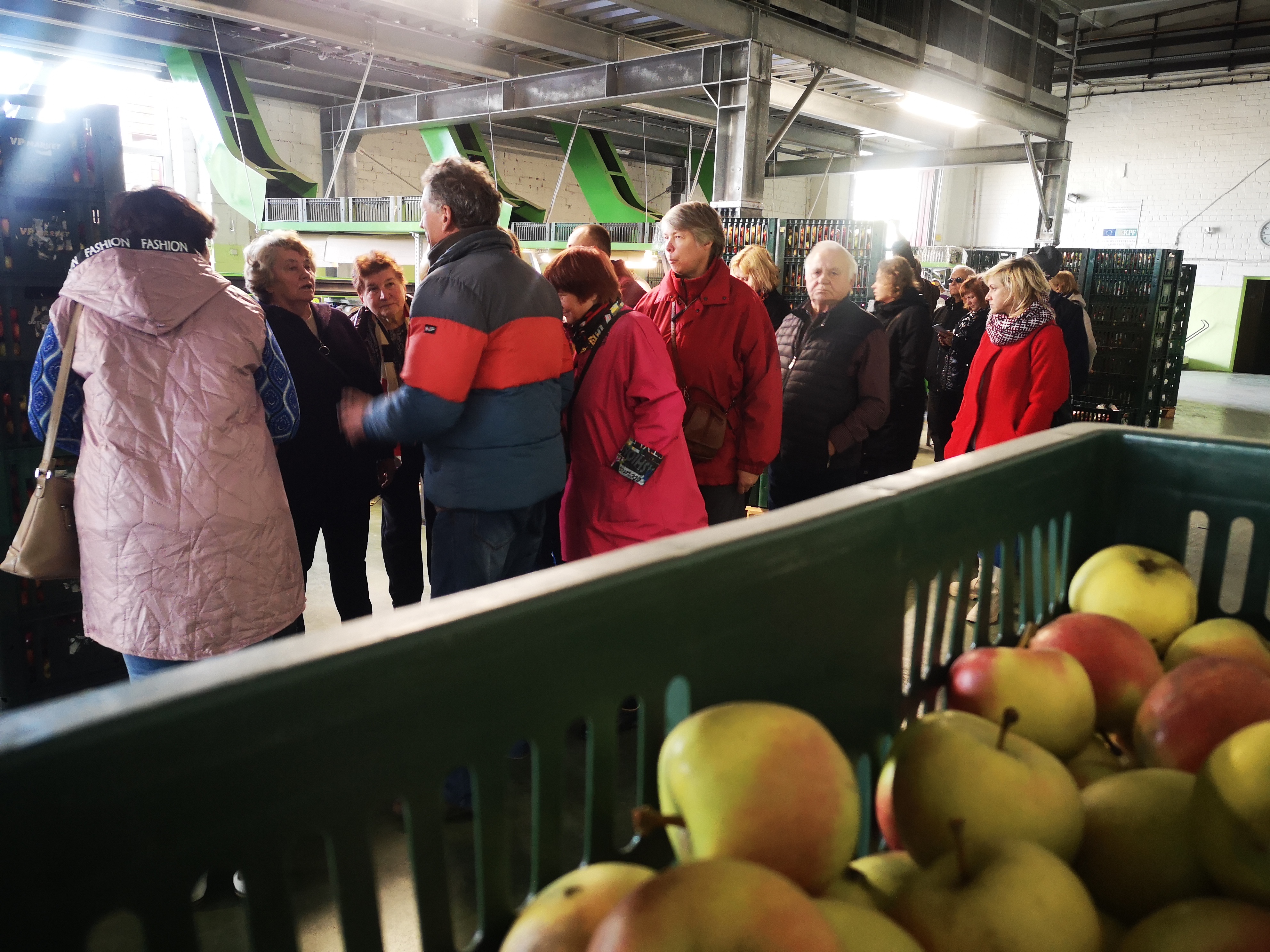 Dienas otrajā pusē dodamies uz a/s “Naradava”, kas nodarbojas ar augļkopību 305 ha platībā – tikai ar ābelēm, senāk tika audzētas arī plūmes un bumbieri, bet, ņemot vērā sugu īpašības, saimniecība izvēlējās attiekties no plūmju un bumbieru audzēšanas. Aptuveni 250 ha aug augļu koki, kas ir pat līdz 50 gadu veci, un 55 ha ir ierīkoti jaunie augļudārzi. Saimniecībā audzē šķirnes Auksis, Lobo, Delikates, Skaistis, Ligols, Čempions. Stādi tiek iepirkti, izmantoti 396, P60, M26, M9 potcelmi. Jaunajiem stādījumiem ir ierīkota pilienveida laistīšanas sistēma. Augu piebarošana notiek pavasarī caur lapām, pavasarī apsmidzina ar boru, kas pasargā no kukaiņiem un salnām. Pamatā tiek nodarbināti ap 50 darbiniekiem un augļu novākšanas laikā nodarbina ap 200 sezonas darbiniekus. Darba samaksa ir 0,03 EUR, ja lasa kritušos (no zemes), no koka 0,07 EUR. Čaklākie lasītāji dienā spējot nopelnīt pat 50 EUR. Piesaistot ES finansējumu, ir uzbūvētas divas noliktavas, iegādāta augļu šķirošanas līnija – darba ražīgums ābolu šķirošanas līnijai ir 10 t/h. Ābolus uzglabā un arī realizē svaigus – Lietuvā, Igaunijā un Latvijā. Ābolus uzglabā angāros, tos šķiro un arī pārstrādā biezenī, no kura arī veido džemu. Biezeni kā izejvielu produkcijas ražošanai iepērk Latvijas uzņēmums “Spilva”.