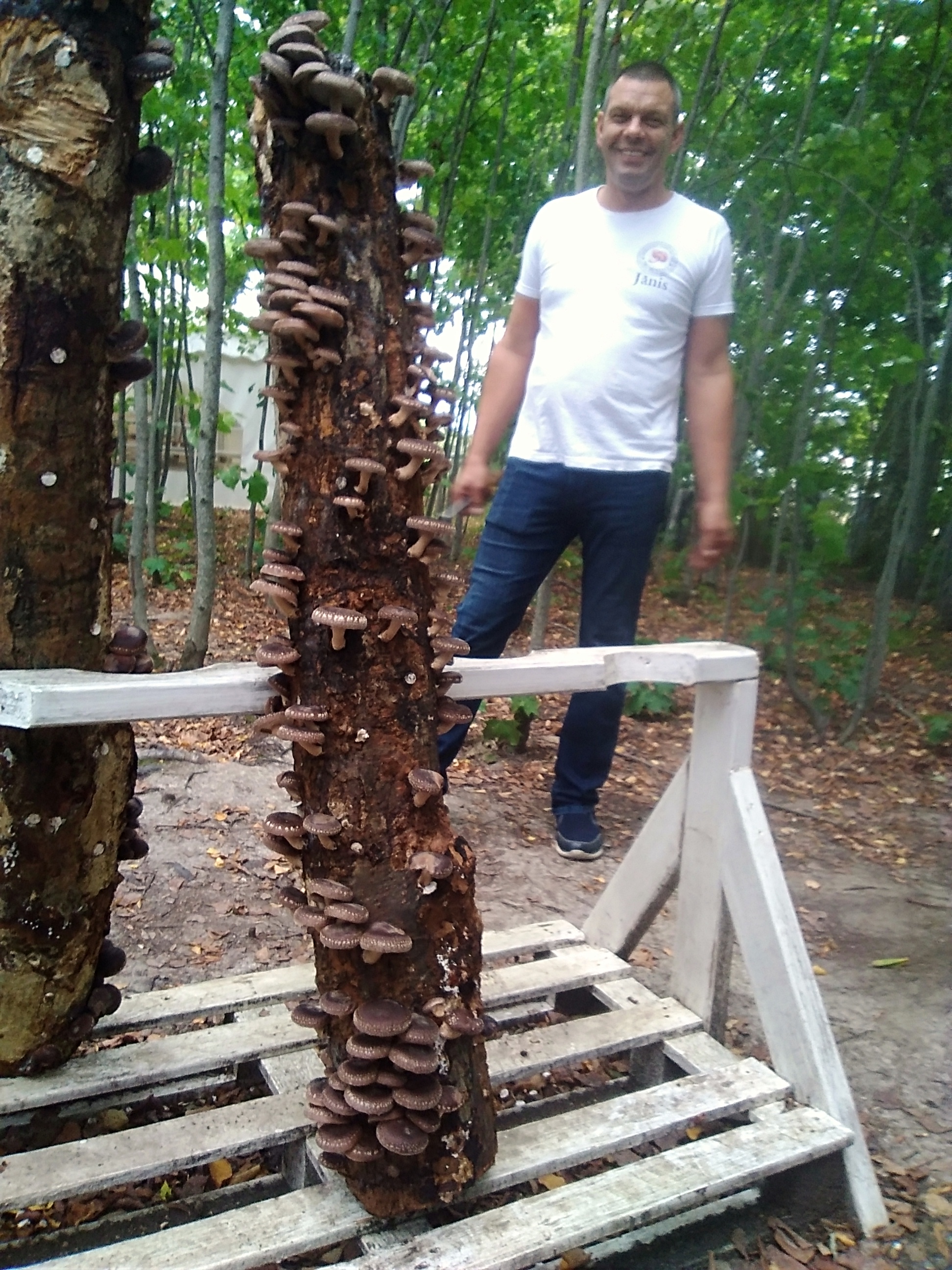 Jau vēlā pēcpusdienā saimnieks Jānis Volksons brauciena dalībniekus sagaida un iepazīstina ar šitake sēņu audzēšanu. Saimnieks ir spilgta personība, kuram izdodas interesantā stāstījumā iepazīstināt ar informāciju par šo aristokrātisko sēni. Šīs netipiskās kultūras audzēšana ne visiem ir pa spēkam. Tā prasa finansiālus ieguldījumus, ļoti daudz zināšanu un lielu precizitāti. No saimniekošanas pirmsākumiem 2016. gadā pieļautās kļūdas ir likušas meklēt risinājumus. Un risinājumi atnāca no Japānas, kur tika atrasta laba stādīšanas iekārta un viss nepieciešamais kvalitatīvam darbam. Šobrīd, klausoties Jāņa stāstījumā, rodas pārliecība, ka par šo sēni saimnieks zina visu. Arī mācību brauciena dalībnieki uzzina par šīs sēnes spējām samazināt holesterīna līmeni, to lietošana veicinot radioaktīvo vielu izvadīšanu no organisma, tās esot bagātas ar minerālvielām. Saimnieks iesaka sēņu pulveri lietot kopā ar kefīru, kas lieliski ienes organismā visas sēņu saturošās vielas. No 13–15 kg svaigu sēņu, kaltēšanas procesa beigās tiek iegūts viens kg sēņu pulvera. Tātad tas ir stiprs koncentrāts. Klausāmies informāciju par sēņu attīstības ciklu. Tās aug kontrolētos apstākļos, kur inkubatorā ir nodrošināts mitrums, temperatūra un CO2 līmenis. Atliek piebilst, ka pēc micēlija sapotēšanas baļķos nepieciešams gaidīt trīs gadus līdz pirmajai ražai. Patīkami uzzināt, ka saimnieks var sēņu produkciju piedāvāt arī ziemas periodā. Speciāli izveidotā inkubatorā pie noteikta režīma sēnes izaug perfektas, tās tiek vāktas pareizajā stadijā. Ja nenovāc savlaicīgi, sēņu sporas sabojā inkubatora darbības sistēmas. Darbinieces pēc sēņu izskata protot atpazīt vajadzīgo novākšanas brīdi.