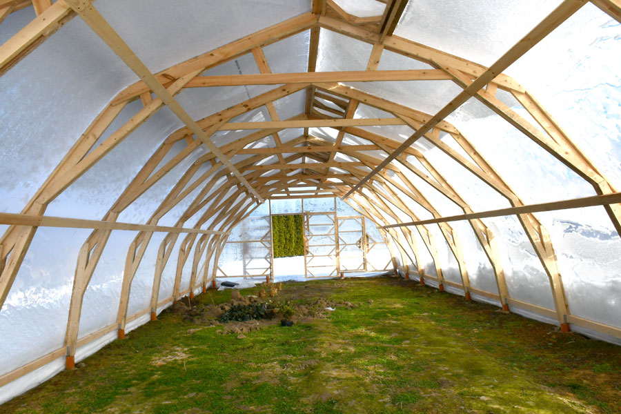 Tālāk «Dobīšu» apskates maršruts ved uz Sandras dārzniecības jaunpienācēju – plašu un augstu koka plēves siltumnīcu, kura vēl pagaidām nav apdzīvota. Tā nomainījusi vienu no vecajām plēves mājām ļoti zīmīgā dienā – pērn 18. novembrī. Siltumnīcai priekšā būs stādu placis ar arkveida jumtu. Tur varēs ērtāk apskatīt ziemcietīgo augu pamatsortimentu. Kāpēc tāda materiālu izvēle, nevis metāls un polikarbonāts? «Esmu koka fane. Varbūt konservatīvi, bet man patīk, kā koks smaržo, tas ir dzīvāks un siltāks materiāls. Plēves mūsdienās ir tik izturīgas – pat uz desmit sezonām. Tai ir seši gadi, bet ir arī tādas, kas izturējušas astoņus,» skaidro «Dobīšu» saimniece.