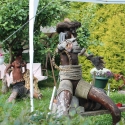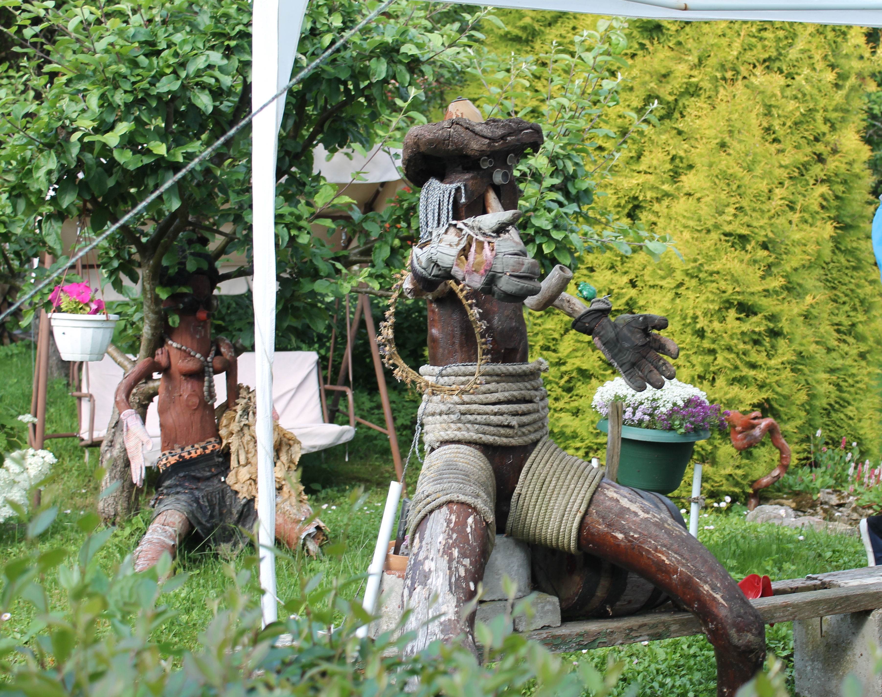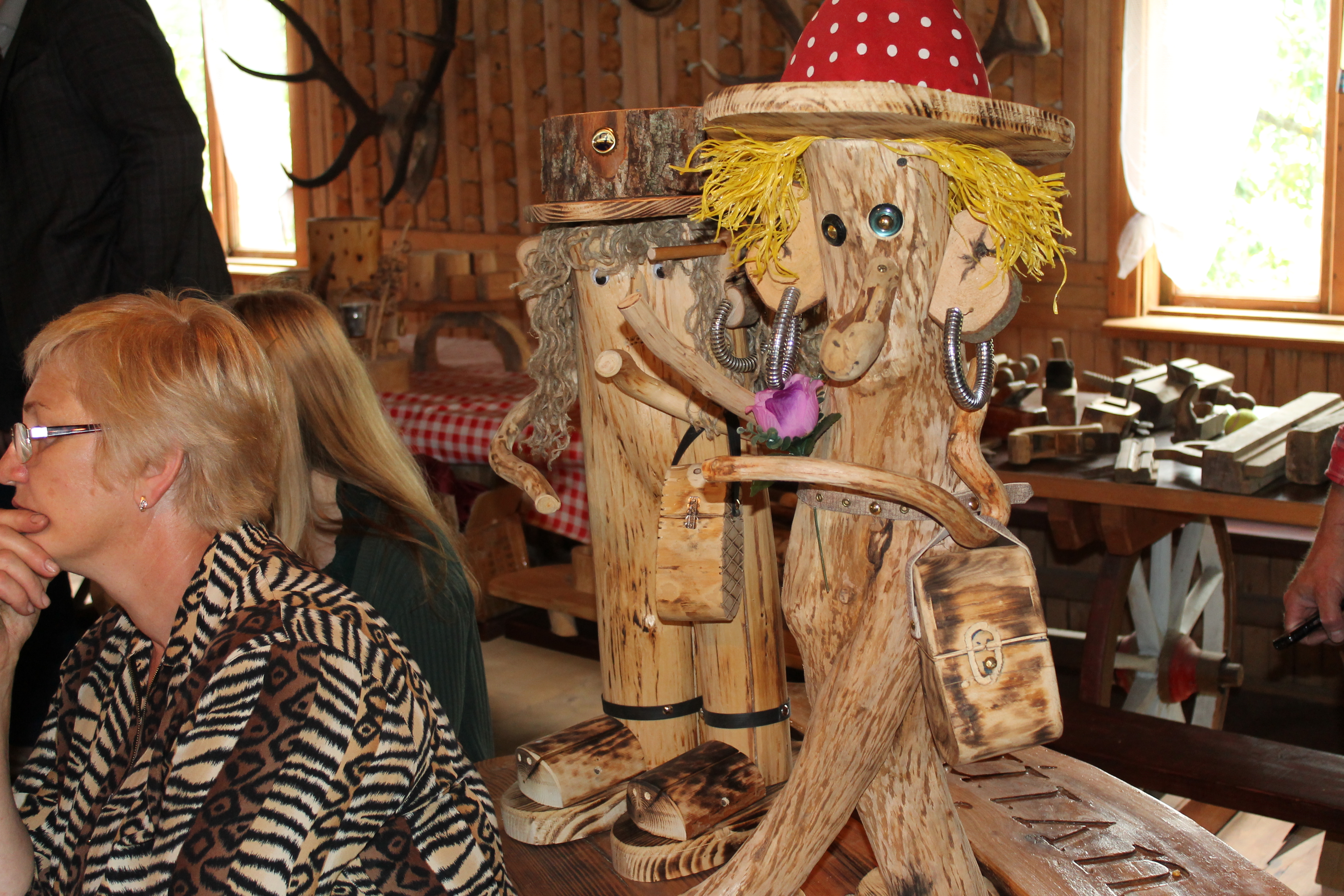 Pēc tam devāmies uz Talsu novada Pastendes „Āboliņiem” pie Laimoņa Birzleja. „Laimoņa darbi un nedarbi” – tā saucas no mežā atrastiem savdabīgiem kokiem veidoti soli, galdi, spēles, pastkastes, dažādi trauki un pat stilizēti zābaki. Par katru no tiem ir savs stāsts, tāpat kā par savu interesanto dzīvi un nodarbošanos. Daļu savu darbu meistars ir uzdāvinājis bērniem.