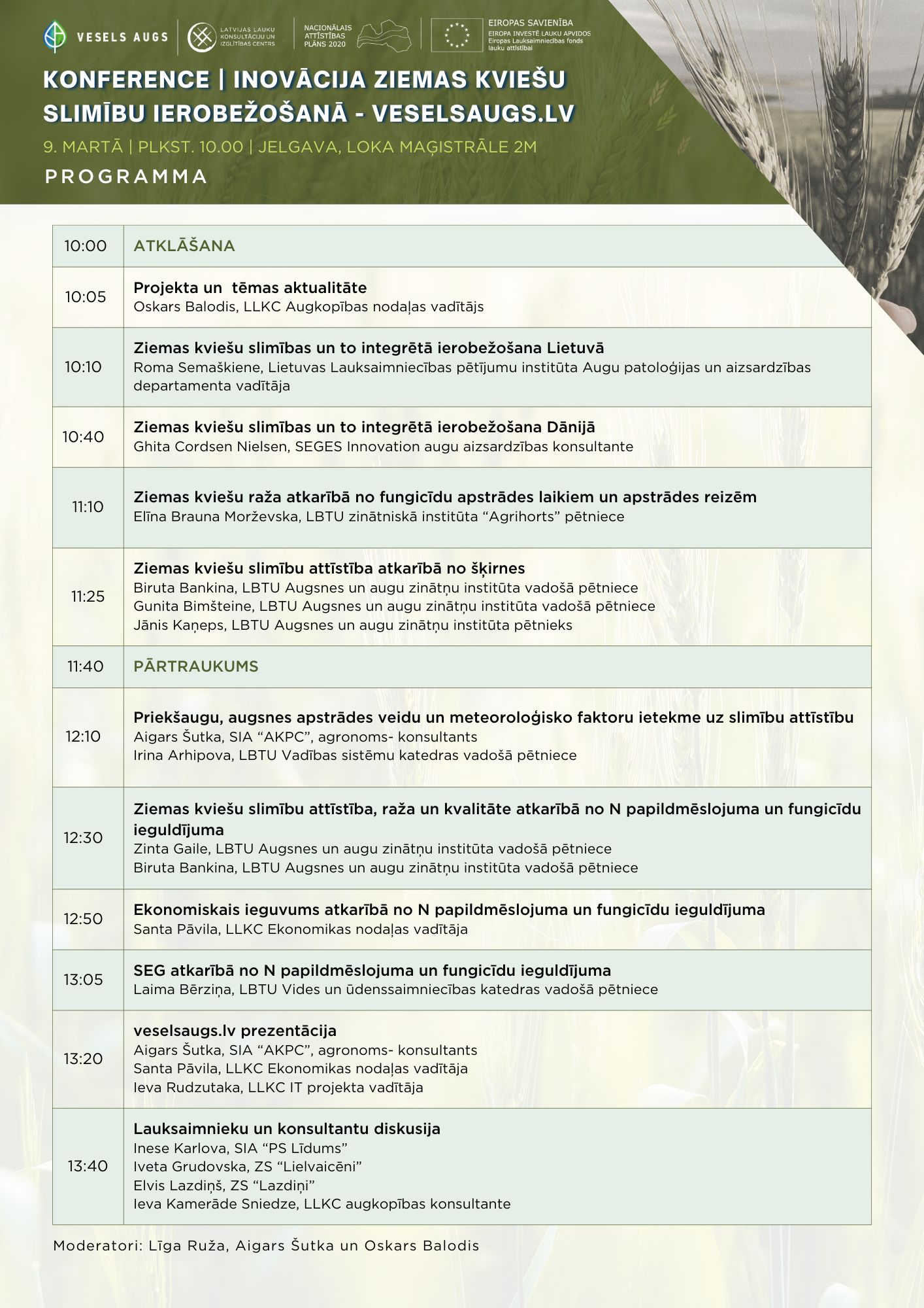 Konferencē varēs uzzināt, kā ziemas kviešu slimību ierobežošanu īsteno ne vien Latvijā, bet arī Lietuvā un Dānijā. Pašmāju eksperti dalīsies pieredzē, kā slimību izplatību ziemas kviešos ietekmē šķirnes izvēle, kāda ir priekšaugu, augsnes apstrādes veidu un meteoroloģisko apstākļu ietekme uz slimību attīstību, kāda ir raža atkarībā no fungicīdu apstrādes laikiem un reižu skaitu, kā arī – ekonomisko ieguvumu no fungicīdu vai slāpekļa papildmēslojuma lietošanas.