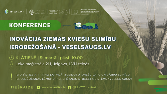 Lai iepazīstinātu ar pirmo Latvijā izveidoto kviešu lapu un vārpu slimību ierobežošanas lēmumu pieņemšanas atbalsta sistēmu “Vesels augs”, Latvijas Lauku konsultāciju un izglītības centrs (LLKC) aicina uz konferenci “Inovācija ziemas kviešu slimību ierobežošanā - veselsaugs.lv”.