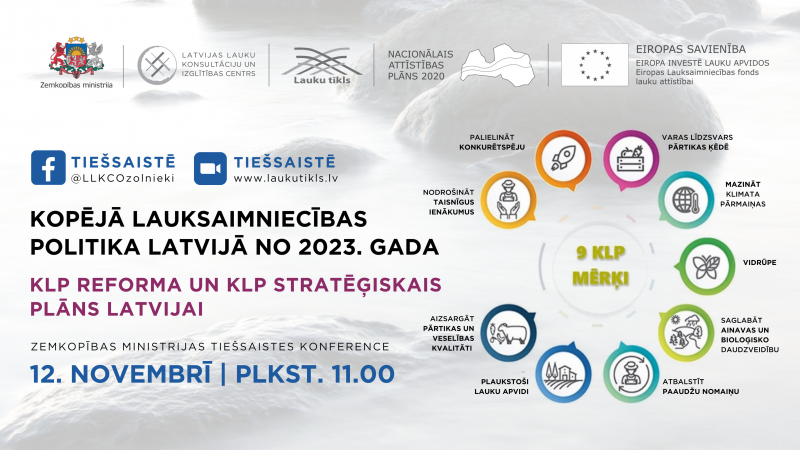 Jau nedaudz vairāk kā pēc gada spēkā stāsies jaunā Eiropas Savienības Kopējā lauksaimniecības politika (KLP). Kādi stratēģiski mērķi tajā ir Latvijai, aicinām uzzināt tiešsaistes konferencē “Kopējā lauksaimniecības politika Latvijā no 2023. gada: KLP reforma un KLP Stratēģiskais plāns Latvijai”, ko sadarbībā ar Zemkopības ministriju (ZM) rīko Latvijas Lauku konsultāciju un izglītības centrs (LLKC).