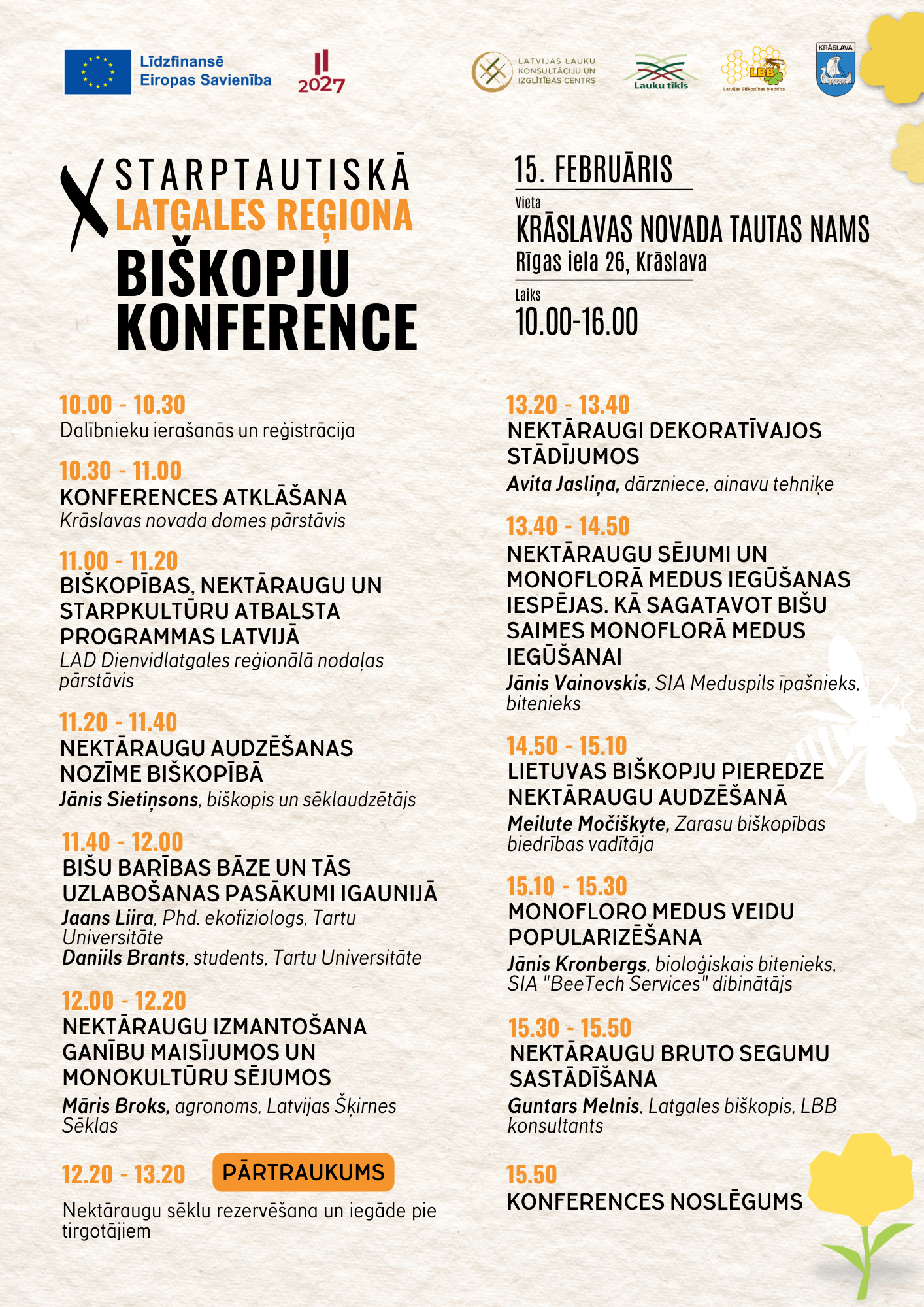 15. februārī Krāslavas novada Tautas namā norisināsies X Starptautiskā Latgales reģiona biškopju konference, ko organizē Latvijas Biškopības biedrība sadarbībā ar Latvijas Lauku konsultāciju un izglītības centru Valsts Kopējās lauksaimniecības politikas tīkla pasākumu ietvaros. Pasākumā pulcēsies biškopji, lauksaimnieki un nozares eksperti no Latvijas, Igaunijas un Lietuvas, lai pārrunātu nektāraugu audzēšanas nozīmi biškopībā, bišu barības bāzes uzlabošanas iespējas un monoflorā medus ieguvi.