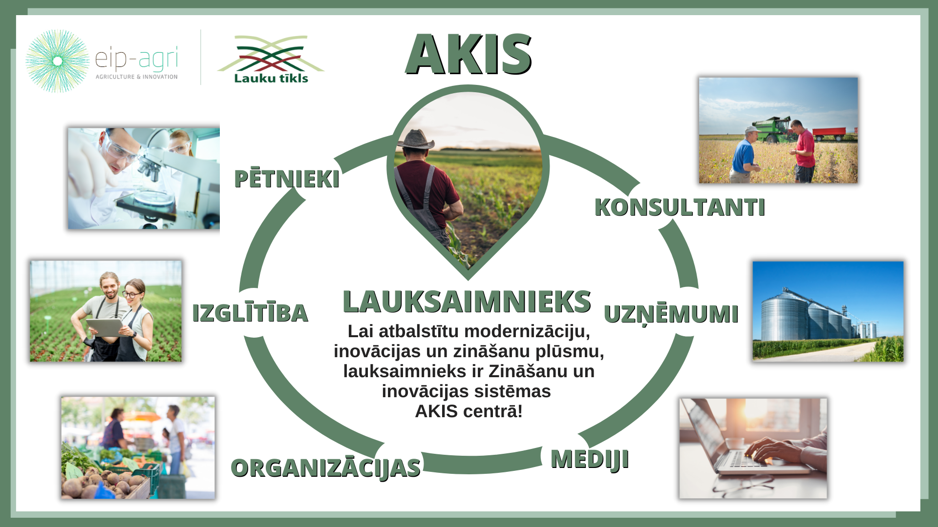 Jau kādu laiku lauksaimniecības un mežsaimniecības nozarēs izskan termins AKIS, kas ir lauksaimniecisko zināšanu un inovāciju sistēma. Tā ietver visus cilvēkus un organizācijas (lauksaimniekus, mežsaimniekus, lauksaimnieku un mežsaimnieku organizācijas un kooperatīvus, konsultantus, pētniekus, uzņēmumus, nevalstiskās organizācijas u. c.), kas rada, dalās un izmanto zināšanas un inovācijas lauksaimniecībai. Kā arī savstarpēji saistītās jomās: lauku apvidi, vērtību ķēdes, vide, klimats, bioloģiskā daudzveidība, sabiedrība un patērētāji. Galvenā iecere, koncentrējoties uz šo sistēmu, ir izmantojot koordinētas darbības, nodrošināt labāko iespējamo zināšanu un inovāciju informācijas apriti, tādējādi sniedzot ievērojamu ieguldījumu lauksaimniecībā un mežsaimniecībā nodarbinātajiem.
